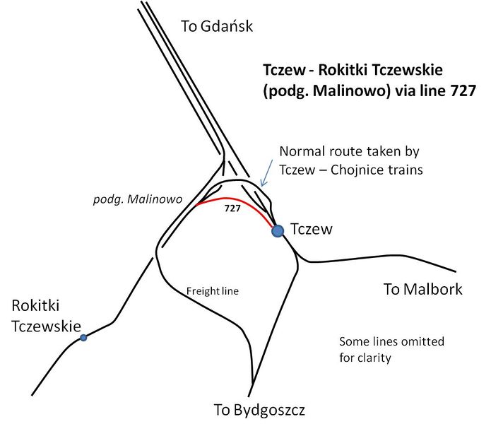 Route of PSUL Tczew - Rokitki Tczewskie (podg. Malinowo) via line 727