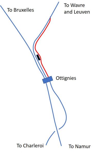 Map of obscure route into Ottignies from Wavre used by some trains