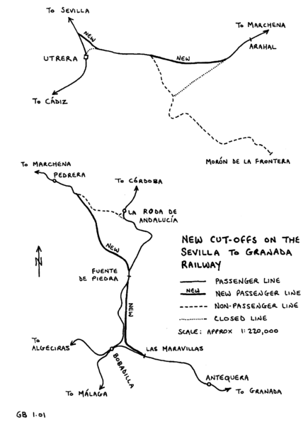 Revision as of 16:43, 12 February 2012 by Paul Steane (talk | contribs) (uploaded a new version of "File:Andalucia.png": The Sevilla - Granada line through Andalucia, showing 1990s cut-offs or Variantes Drawn December 2000 © Gregory Beecroft)